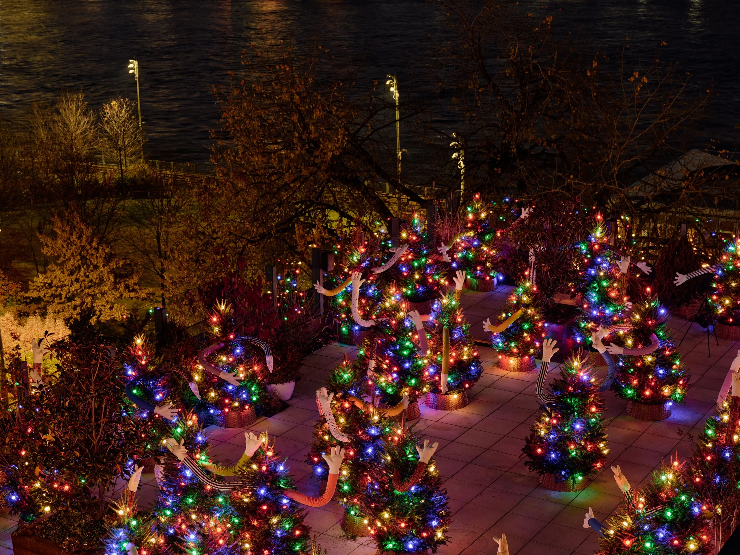 The Christmas trees overlook the Brooklyn Bridge, DUMBO ice rink, and Manhattan’s skyline. The interactive installation invites viewers to play with the arms, hold their hands, and even give it a hug. Each tree’s arms have different colors, patterns, and fabrics—conveying that regardless of who we are or what we do, we require human connection.