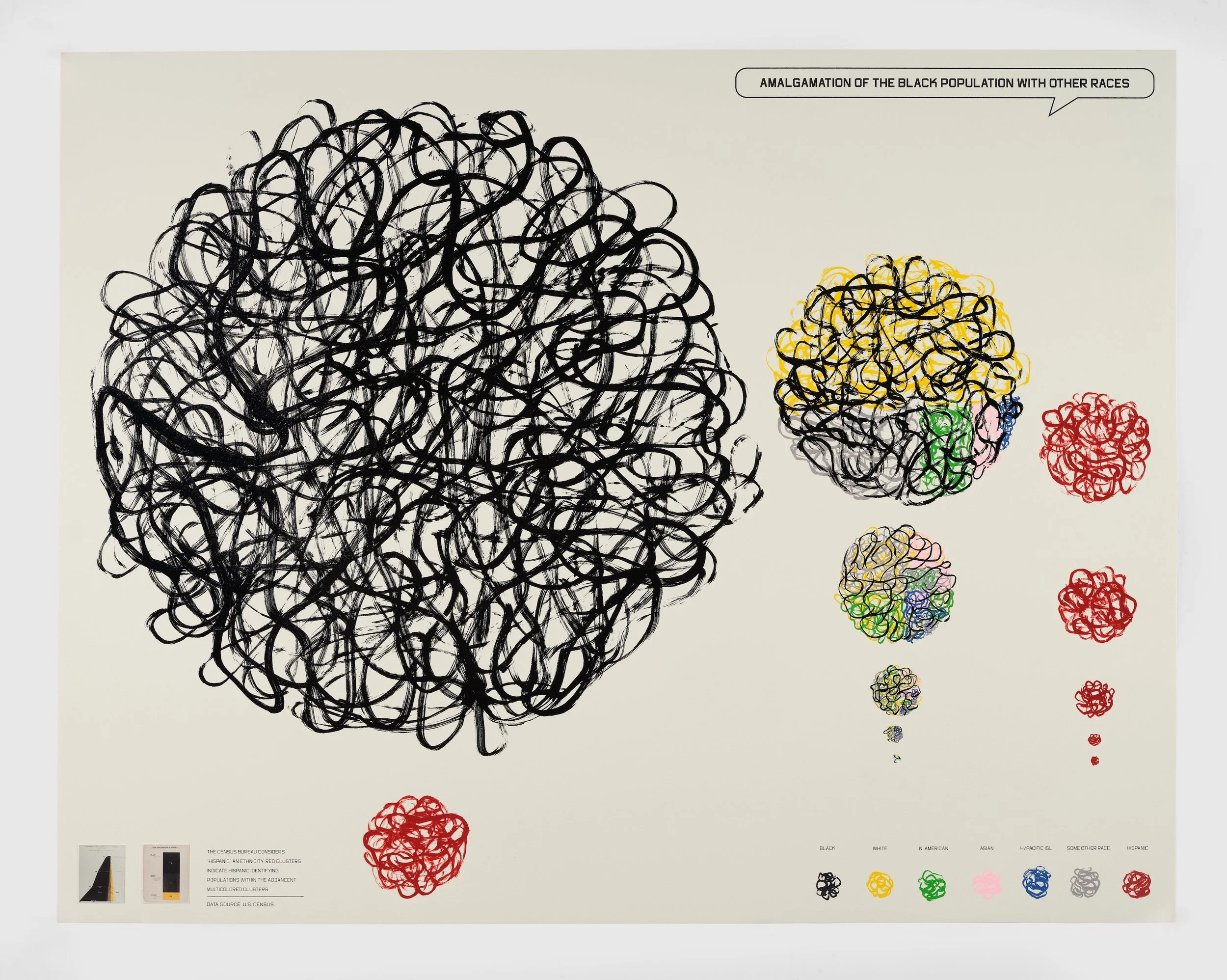 To bring Data Consciousness to life, these artists came together to envision expansive information on Du Bois’s legacy and how his efforts still apply today. Together, artist William Villalongo and urbanist Shraddha Ramani created a collaborative research-based print portfolio titled Printing Black America: DuBois’s Data Portraits in the 21st Century. This project examines the data visualization of the Black population, as presented in the U.S. Census, and images from six print publishers across the United States and Puerto Rico.