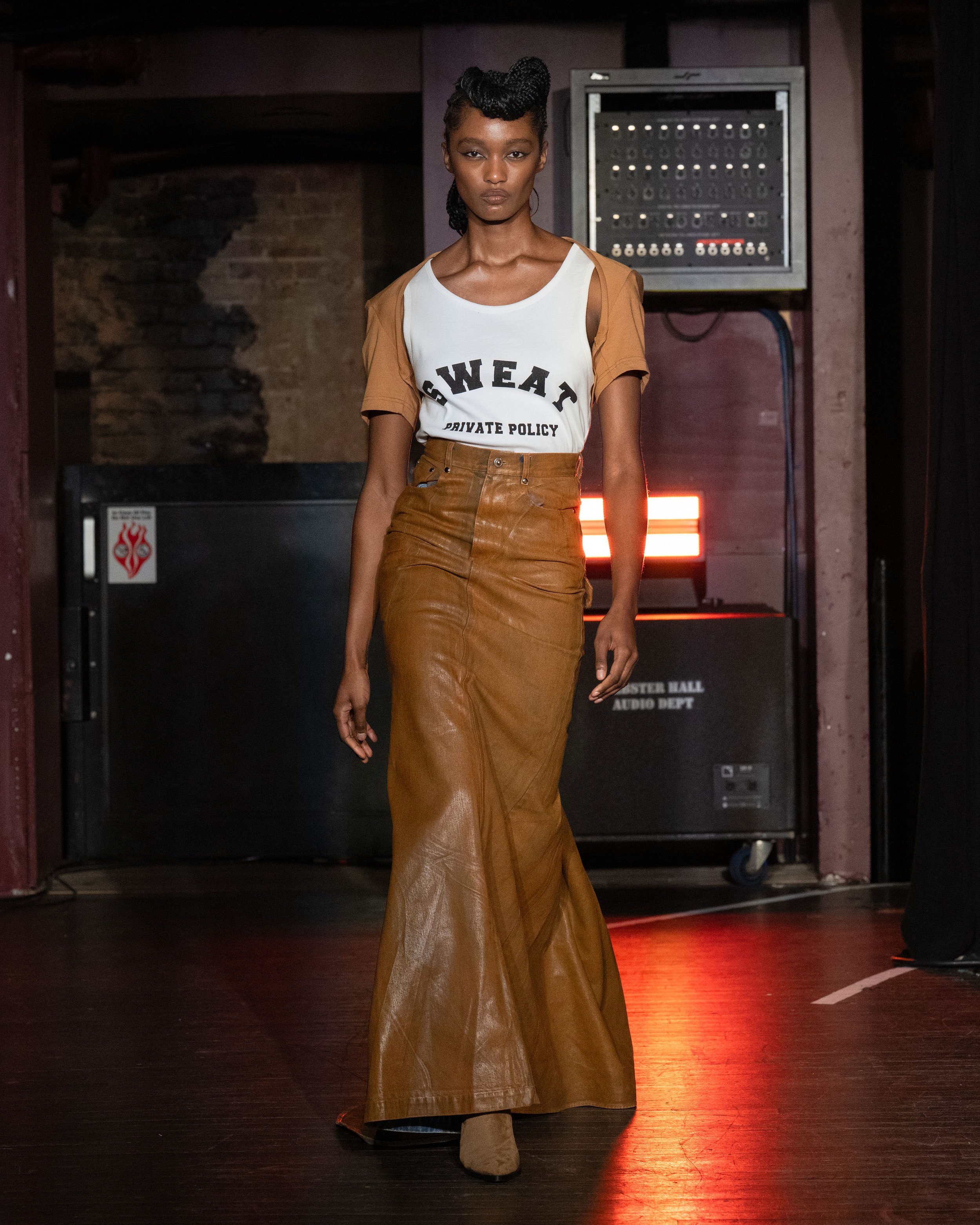 Plaid appeared throughout, grounding the runway in a visual language associated with labor and Americana, while sharp tailoring and streetwear proportions pulled the pieces into the present. It felt like structured workwear meeting urban utility: disciplined but contemporary. Amid these silhouettes, graphic shirts emblazoned with the word “SWEAT” cut through the atmosphere. Stamped above the Private Policy logo, the message refused subtlety. Worn alongside polished tailoring and high-sheen fabrics, the word operated as a reminder: glamour is not detached from labor. It is built on it.