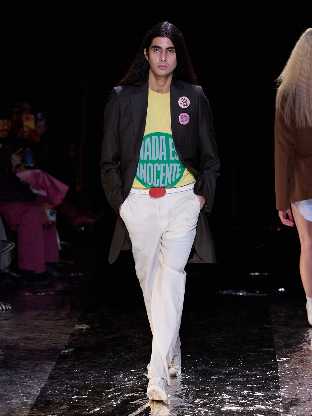 These essential, subtle, daily garments are interrupted by political graphics that confront the U.S. and Caribbean political climate: ICE raids, government corruption, colonization, and racism—themes no stranger to the brand’s ethos. Sayings on t-shirts and pins read, “It’s better in the Caribbean,” “Nada es inocente,” “Tell the world you’re against discrimination,” and “Presente.” Brooches and shoulder pads made of hair dangle from blazers and outerwear, an elusive message that only made us think of hair discrimination that Black and Brown people often face because of different hair textures.