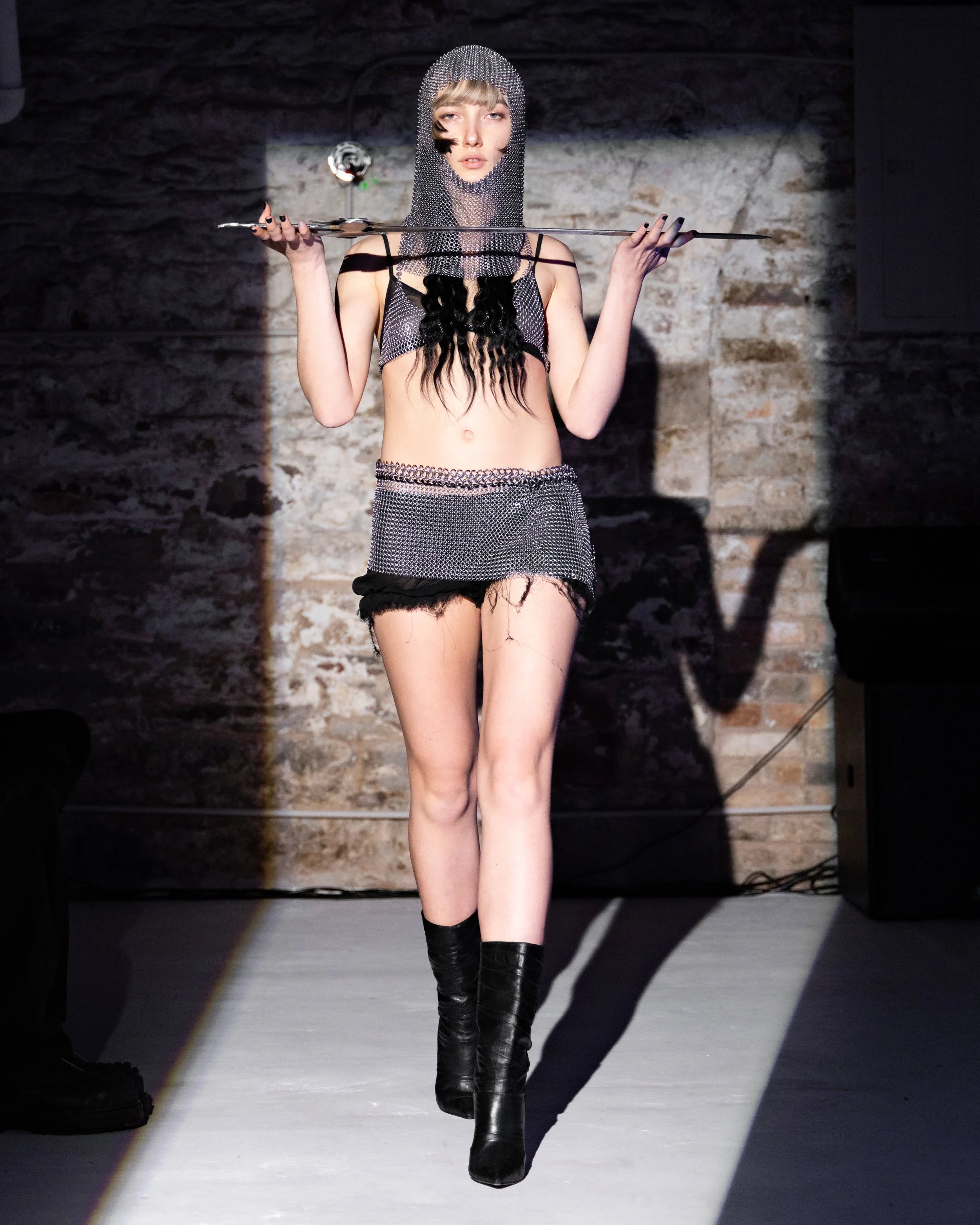 We were faced with so many challenges. The chainmail itself broke during the show under the weight and pressure, and it was the closing look. I was about to go on the runway, I lifted my arms, and my bra broke on my chest, but we fixed it quickly. A lot of the materials are deadstock, and many aren’t available anymore. The hardware was the main challenge we faced. In the end, everything worked out ideally despite the blizzard.